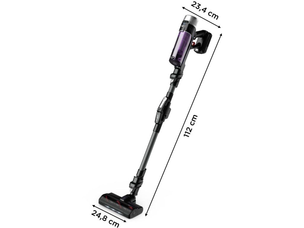 A porszívó könnyen tárolható a falra szerelhető töltőállomásnak és tartónak köszönhetően. 0,4 l tartálytérfogatával és könnyű testével ideális kisebb helyiségekbe is. Az elegáns lila-fekete design jól illeszkedik a modern otthonokba.
